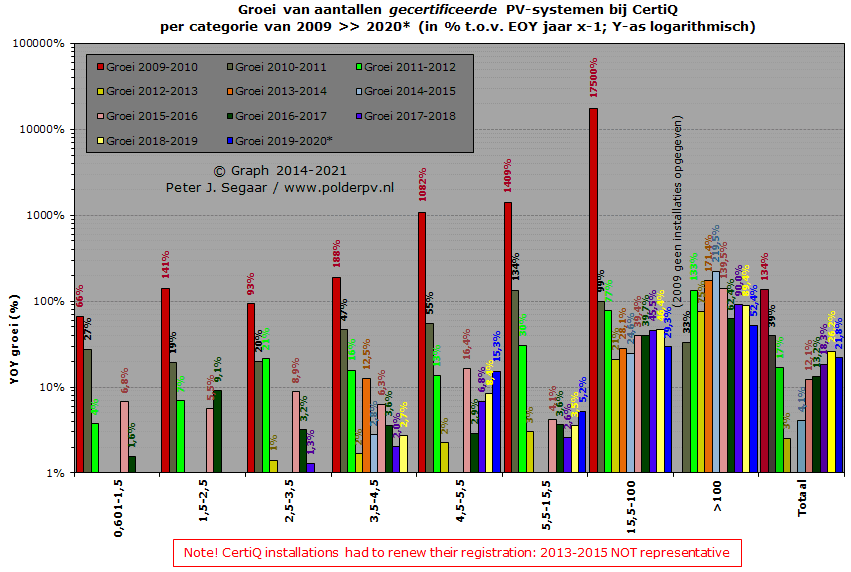 Het eerste cijfer voor 2020, 5.316,7 MWp, zal ook, naar analogie van wat er met de data voor 2019 en in voorgaande jaren is geschied, later worden bijgesteld. Dit zal mogelijk ook "de nodige procenten meer" gaan worden, al weten we natuurlijk nog lang niet hoeveel meer. Voorlopig is in ieder geval de jaargroei t.o.v. het hier boven genoemde gereviseerde EOY cijfer voor 2019 al 2.036,4 MWp. Alleen dit, het nieuwe project volume voor 2020, bekend bij CertiQ, is al ruim 67% van het totale nieuwe jaarvolume van 2020, wat uit de eerste data van het CBS voor afgelopen jaar in haar laatste update ge-extraheerd kon worden (3.036 MWp, dus inclusief alle andere projecten, waar onder de omvangrijke residentiële markt).