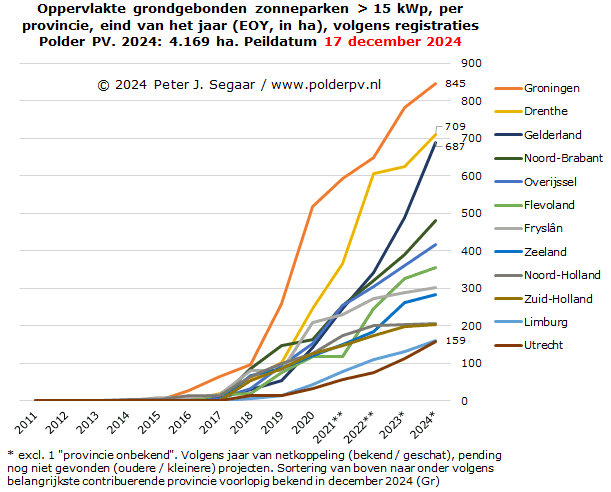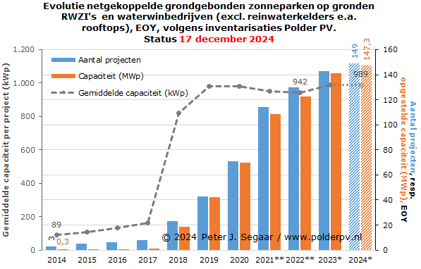 Vervolgens wordt gesteld: "In de jaren 2021 tot en met 2023 groeide het vermogen dat zonneparken leveren met 2,4 gigawatt (een groei van 115 procent ten opzicht van 2020)". Beperken we ons hierbij tot uitsluitend de veldprojecten + drijvende exemplaren, komt Polder PV voor de jaren 2021 tm. 2023 op de volgende cijfers: 910 MWp (YOY 2021) + 1.199 MWp (YOY 2022) + 1.040 MWp (YOY 2023) = totaal 3.149 MWp. Een toename van 177 procent t.o.v. de 1.138 MWp aanwas in 2020 (!). Wederom een zeer groot verschil, dus.