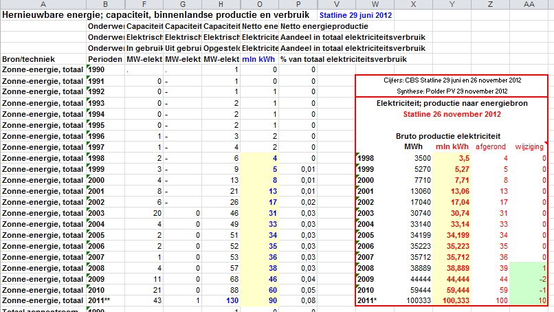 StatLine tabel Deze laatste reeks heb ik - vanaf jaar 1998 - in een lichtgeel veld met blauwe getallen weergegeven, zichtbaar in kolom "O". Om nu 1 op 1 te kunnen vergelijken met de nieuwste gegevens uit de andere StatLine tabel, heb ik in de rood omkaderde nieuwe tabel eerst de nieuwste cijfers ook in GWh (mln kWh) omgerekend door kolom "X" te delen door 1.000. Hieruit volgt uiteraard een resultaat in GWh met drie cijfers achter de komma, met rode getallen in een lichtgeel veld, weergegeven in kolom "Y". Vervolgens heb ik de "afronding" functie van Excel gebruikt waardoor in kolom "Z" de productie in GWh in hele getallen komt te staan. Hieruit is direct duidelijk dat de laatste jaren andere getallen staan vermeld. Het verschil met de "oude" tabel van 29 juni 2012 (weergegeven in kolom "O") is evident, en heb ik berekend in kolom "AA". Waar het verschil ongelijk aan nul is, heb ik de verschilwaarden in een groen veld weergegeven. Verschillen