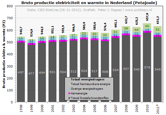 grafiek "Overige energiedragers" (expansieturbines in centrales die huishoudelijk en industrieel afval verwerken, lichtblauw) zat op 20 PJ (3,3%). Het restant betreft energie opwekking (elektra en warmte) uit hernieuwbaar geachte bronnen (lichtgroen). Groeiend naar 52 PJ in 2011, een aandeel hebbend van slechts 8,2% (elektra plus warmte). Voor alleen elektra is het aandeel zoals eerder getoond gestegen naar 10,9% op de totale stroom productie. Maar dat is naast groei van windenergie (liability: kan weer gaan tegenvallen in een relatief windarm jaar) vooral te wijten aan een toename van de modaliteit biomassa. Reacties (deels op GoT, 30 november 2012):