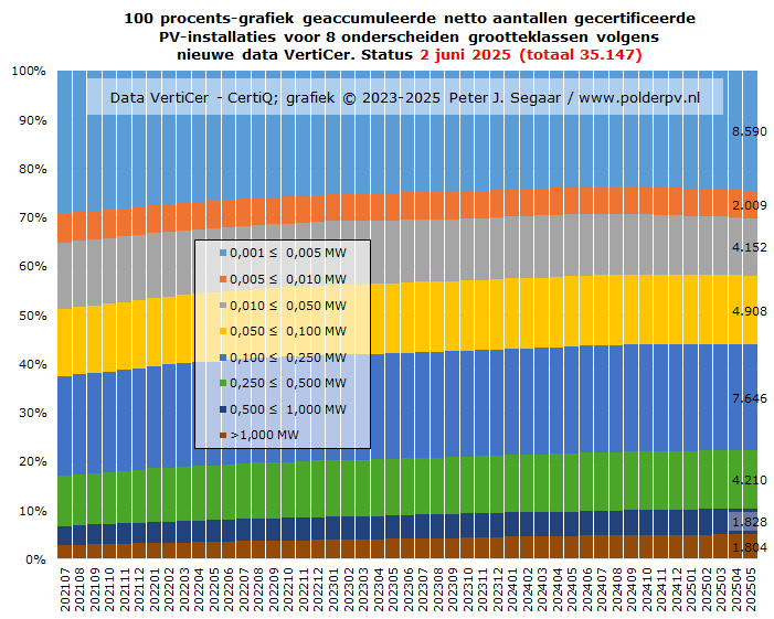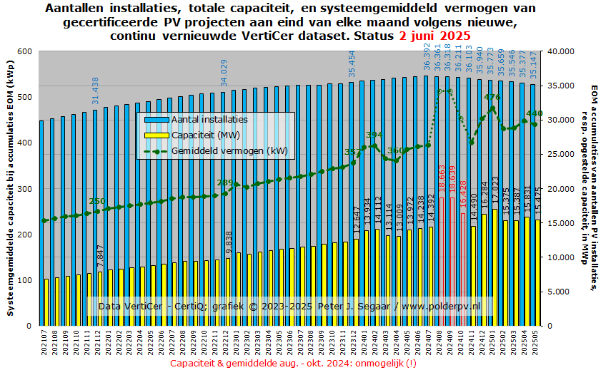 In deze grafiek, met de meest recente actuele en gewijzigde data uit de mei 2025 rapportage van VertiCer, en deels oudere data uit de CertiQ updates, de stand van zaken vanaf juli 2021 tm. mei 2025. De blauwe kolommen geven de ontwikkeling van de aantallen installaties weer (ref.: rechter Y-as), voorlopig culminerend in 35.147 exemplaren, begin juni 2025. Wat, wederom, een netto negatieve groei weergeeft van 230 projecten** t.o.v. de status, eind april 2025 (gereviseerd, 35.377 exemplaren), en wat zelfs al 1.245 exemplaren minder is dan het tot nog toe hoogste niveau (36.392 in, inmiddels, juli 2024, gereviseerd).