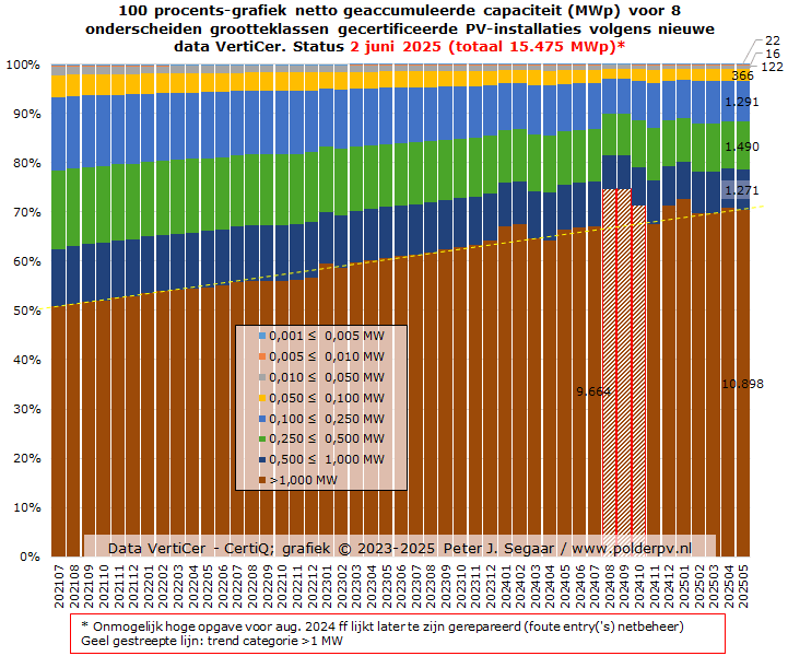 In januari 2025 nam het niveau zelfs nog verder toe, naar netto 17.023 MWp, maar eind februari is het volume t.o.v. januari weer flink onderuit gegaan, naar 15.375 MWp. Daarna bleef de accumulatie grofweg op een vergelijkbaar niveau, met een klein piekje voor april (15,8 GWp), om eind mei voorlopig op 15.475 MWp uit te komen. Wat structureel veel lager ligt dan het "nieuwe cumulatie record" van januari dit jaar. Vreemde wijzigingen en accumulatie cijfers blijven dus terugkeren in de VertiCer cijfers. Het is zeer lastig om hier het hoofd koel bij te houden, en om "logische trends" in de continu wijzigende cijfers te ontdekken.