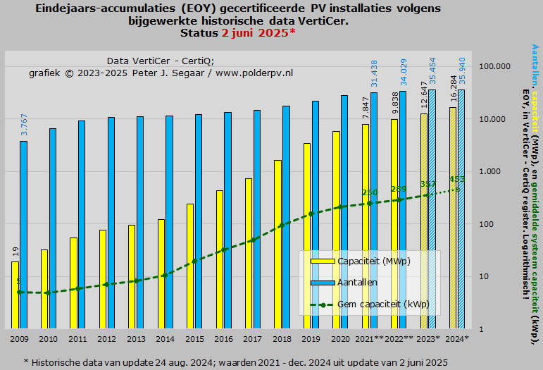 De tweede grafiek in deze sectie geeft niet de maandelijkse progressie (paragraaf 2a), maar de evolutie van de eindejaars-accumulaties van 2009 tm., achteraan, 2024 weer, met alle ondertussen weer gewijzigde data in de huidige VertiCer update. De opbouw van de grafiek is vergelijkbaar met die voor de laatste maand-cijfers, maar om alle data in 1 grafiek te krijgen zonder extreme verschillen, is de Y-as voor alle drie de parameters hier logarithmisch gekozen. Het aantal installaties is fors toegenomen, van 3.767 exemplaren, eind 2009, naar 34.029, eind 2022, resulterend in een Compound Annual Growth Rate (CAGR) van gemiddeld 18,4% per jaar in 2009-2022. Eind december 2023 staat de teller alweer op 35.454 projecten; de CAGR voor de periode 2009-2023 heeft, met de nog voorlopige data voor met name 2023, een gemiddelde van 17,4% per jaar.