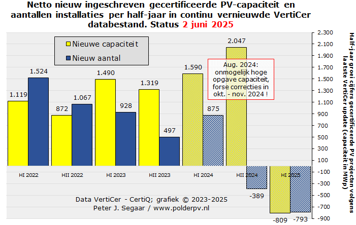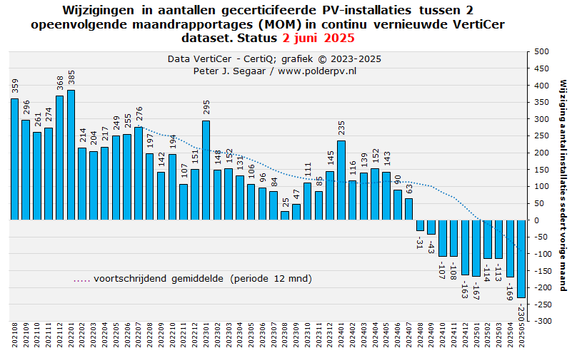 Werden er in januari 2022 nog netto 385 nieuwe gecertificeerde PV-projecten bijgeschreven, is dat in de rest van het jaar al zeer duidelijk minder geworden, en vanaf augustus dat jaar zelfs zeer sterk "afgekoeld". Met wat ups en downs, is het laagste volume in dat jaar voorlopig bereikt in november 2022, met 107 (netto) nieuwe installaties. Daarna veerde het weer even op, daalde stapsgewijs, leidde tijdelijk tot een inmiddels licht positieve groei van netto 25 nieuwe projecten in augustus 2023 en verdere positieve groei in september tm. december. In 2024 zijn de aanwas cijfers per maand tm. mei tm. juli in de update van maart 2025 voor het eerst netto, in de eerste updates ook vaak negatief, al in de plus geraakt, al liggen ze op een zeer "bescheiden" niveau. De aanwas cijfers voor de resterende maanden in 2024, en de eerste voor 2025, zijn nu nog negatief, maar wel weer minder sterk dan in de vorige update. Januari tm. mei 2025 startten met de eerste waarde ook flink onder de nullijn, met, inmiddels, netto minus 167, -114, -113, -169, resp. -230 projecten. Ook dat kan / zal waarschijnlijk in latere updates omslaan in positieve, doch relatief lage groei.