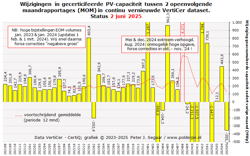 In een vorige rapportage (maart 2024) heeft dit proces zich herhaald, voor het eerste groeicijfer voor die maand. Terwijl de groei in februari 2024 evolueerde van een "bescheiden" negatieve 11,7 MWp naar een inmiddels "normale" positieve 176,9 MWp, kwam maart opeens met een record negatief groei volume van -1.140,9 MWp (!). Dat is in de huidige, mei 2025 update, weliswaar verminderd, maar is nog steeds sterk negatief (-998,0 MWp). Ook deze extreme netto negatieve groei is zeer slecht verklaarbaar.