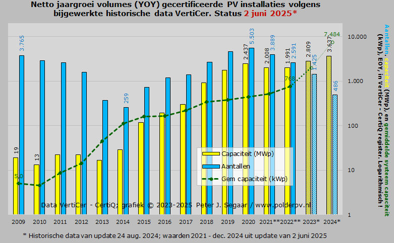 In de huidige rapportage brengt Polder PV, na te zijn terug gekeerd van vakantie, de nieuwe resultaten uit de data rapportage van VertiCer, voor mei 2025, waarmee de jaargroei in kalenderjaar 2023 inmiddels op het voorgaande record niveau blijkt te zijn gestabiliseerd t.o.v. het volume in 2022, na eerder al het voormalige topjaar 2020 al ver achter zich te hebben gelaten, m.b.t. de gerealiseerde, gecertificeerde PV capaciteit. Met de huidige cijfers voor 2024 zou dat jaar een nieuw record niveau van ruim 3,6 GWp groei hebben bereikt, maar dit lijkt ook gezien andere marktcijfers onmogelijk, en zal zeer waarschijnlijk later fors neerwaarts worden bijgesteld.