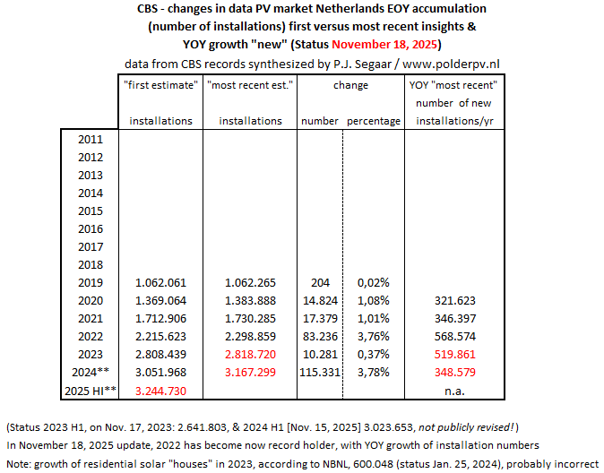 Voor de jaren 2023 en 2024 zijn tevens de geschatte AC vermogens inmiddels gewijzigd. Bovendien zijn nu de aller-eerste data voor medio 2025 (eind 2e kwartaal) bekend gemaakt. Er zouden eind juni 2025 3,24 miljoen PV installaties zijn geaccumuleerd, met een gezamenlijk vermogen van 28.626 MWp. Dat is slechts 647 MWp meer dan eind 2024, wat beslist een forse verdere markt-afkoeling weergeeft. Maar niet vergeten moet worden dat dit soort eerste cijfers later zeer fors worden bijgesteld in volgende CBS updates, zoals de flink fluctuerende cijfers voor 2024 alweer hebben laten zien.