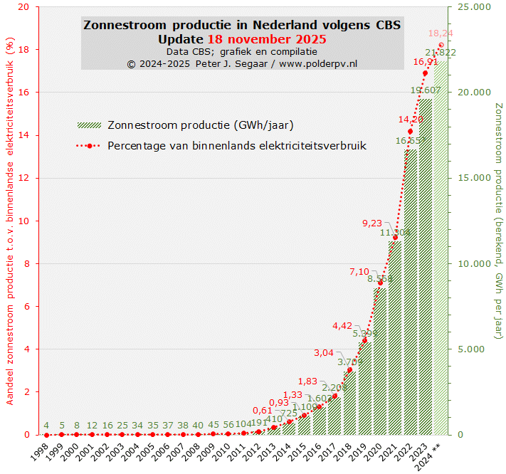 In dezelfde tabel met de nieuwste PV cijfers, zijn ook de kalenderjaar volumes voor de berekende zonnestroom producties weergegeven. Deze blijken inmiddels te zijn gelijkgesteld aan de data in andere PV tabellen bij het CBS. Hier zijn de vermoedelijk correcte cijfers uit de tabel "Hernieuwbare elektriciteit; productie en vermogen" genomen, ook van 18 november 2025. Er is 1 cijfer iets afwijkend in de huidige tabel (2022, 2 GWh minder dan in de CBS tabel "Zonnestroom; vermogen en vermogensklasse, bedrijven en woningen, regio"). In laatstgenoemde tabel is ook nog de eerst berekende opbrengst voor het eerste half jaar van 2025 opgegeven (niet getoond in de grafiek). Dat is nu al berekend op 14.495 GWh, wat veel belooft voor het uiteindelijke jaarvolume. Het is immers tot nog toe een zonnig jaar geweest (Bluesky post Anton Boonstra: januari tm. oktober 11,2% meer instraling dan in dezelfde periode in 2024), dus het eindresultaat zal sowieso ver over dat van 2024 heen gaan. Hoeveel meer, is nog "even" afwachten.