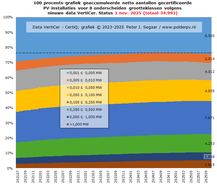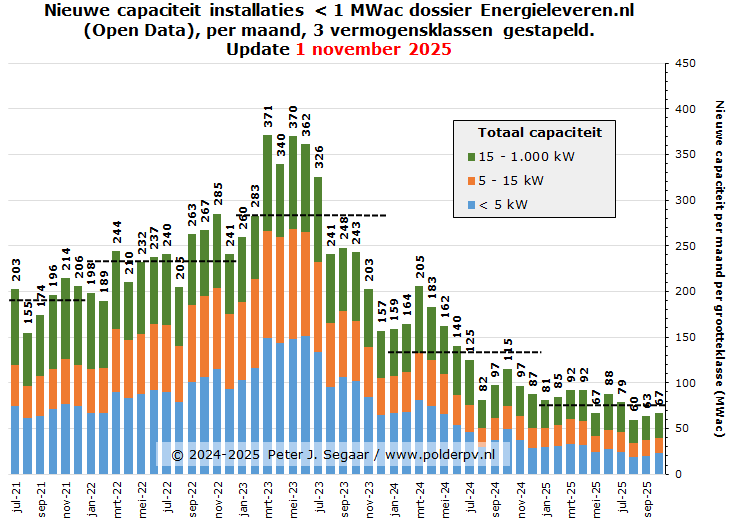 Met de toevoeging in oktober zijn er begin november 2025 in totaal nu bijna 3,27 miljoen PV installaties per stuk < 1 MWac bekend bij energieleveren.nl, volgens de optelling van de drie grootte-categorieën. Hierbij nogmaals de bekende disclaimer: dat is niet het aantal woningen, of dergelijke claims. Er worden immers zeer regelmatig uitbreidingen (= "installaties") aan bestaande projecten toegevoegd, zowel residentieel, als in de projecten markt, een endemisch verschijnsel in Nederland. Het aantal "objecten", "erven", "project sites", is, derhalve, altijd (veel) lager, dan bovengenoemd getal. Wat, desondanks, natuurlijk zonder meer een spectaculair volume blijft weergeven.