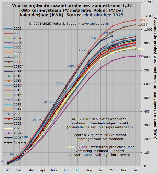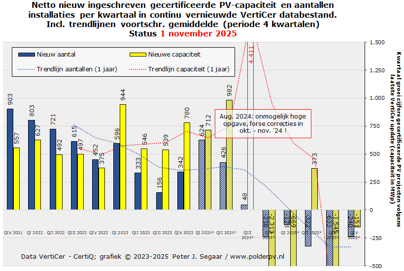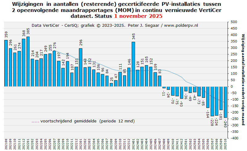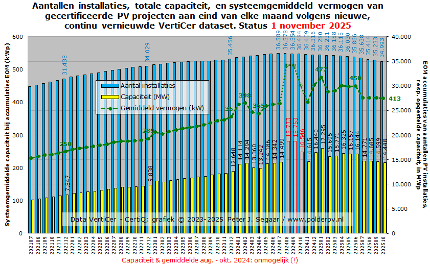 Februari tot en met april 2025 deden het marginaal beter, met 16.225, 17.235, resp. 17.329 nieuwe installaties, met een gezamenlijke AC capaciteit van 84,8, 92,1, resp. 91,9 MWac. Resulterend in gemiddeld vermogens van 5,22, 5,35, resp. 5,30 kWac per nieuwe installatie. In mei werd een nieuw dieptepunt bereikt, met nog maar 12.565 nieuwe registraties, resp. 67,2 MWac, en een gemiddeld vermogen van 5,35 kWac. De daarop volgende vakantie maanden juni tm. augustus voegden 88,2, 78,9, resp. een nieuw dieptepunt, 59,7 MWac toe, en 14.280, 13.565, resp., wederom het laagste niveau, 10.109 nieuwe registraties. Het gemiddelde per nieuwe registratie, opvallend hoog in juni (6,18 kWac), viel in juli tm. oktober weer terug naar 5,82, 5,91, 5,85, resp. 5,42 kWac per nieuwe registratie. Het niveau lag in oktober 2025, wat de aantallen registraties betreft, op een zwaar tegenvallende 55% t.o.v. de hoeveelheid in oktober 2024, wat zelf al 51% minder was dan het nieuwe volume in oktober van het recordjaar 2023.