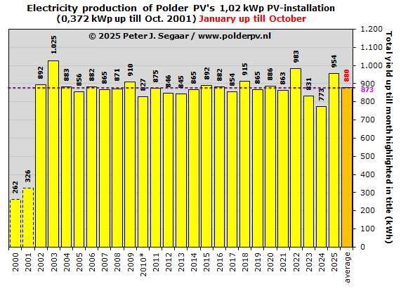 Hetzelfde geldt, voor het eerste resultaat voor 2025, waarvoor het gemiddelde verder is doorgestegen, naar 3.307 kWp. Vandaar dat ik de laatste lijnstukken gestippeld heb weergegeven.